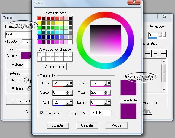 g) Al apoyar la Flecha sobre el triangulito negro se abre la gama de colores/Elegir/Aceptar