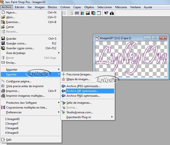 n) Archivo/Exportar/Archivo gif optimizado/Ver captura